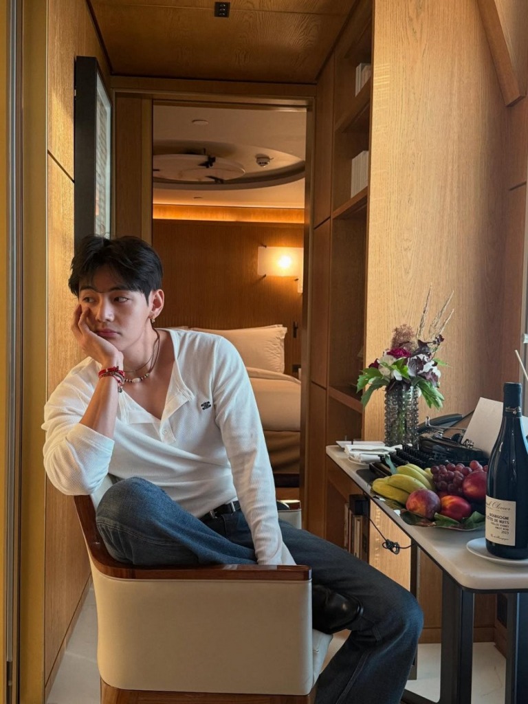 И в завершающий день рабочей поездки Ви вновь привлёк внимание фанатов к своей одежде. На парне красовалась белая футболка с надписью «Limbo» и синие джинсы. За плечом участник BTS носил сумку плюшевого медвежонка, вызывая милые чувства у поклонников.