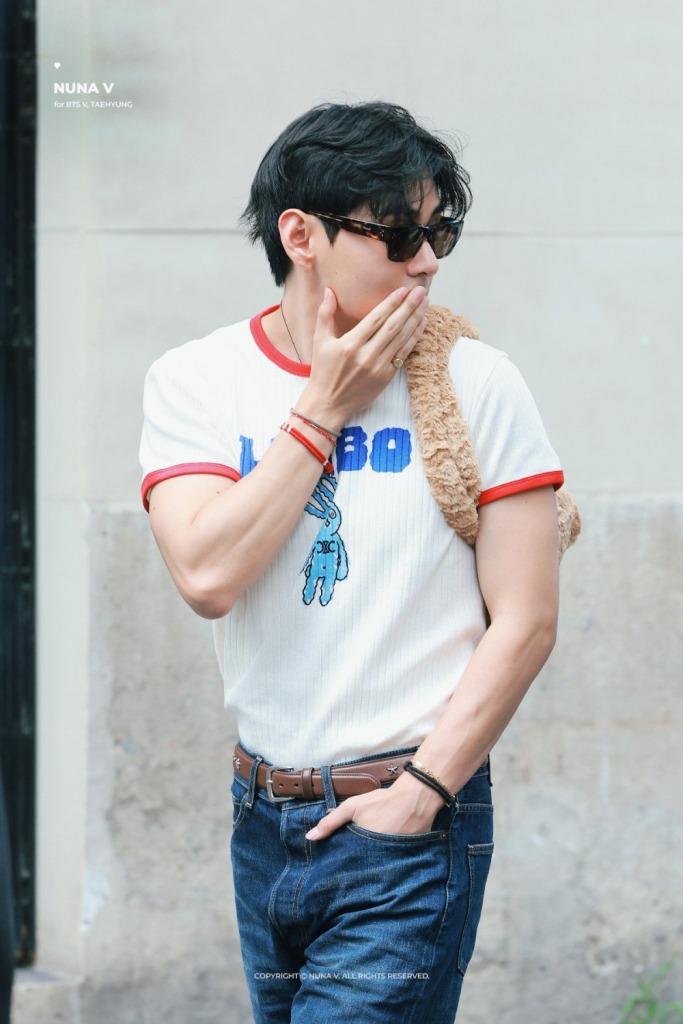 Для первого выхода на улицы Парижа айдол подобрал джинсы клёш, белую майку и черную косуху. Растрёпанные волосы дополняли этот бандитский образ. На третий день пребывания в модной столице ТэХён вышел из отеля в футболке-поло в сине-красную полоску. Джинсы остались неизменными. Вокалист поприветствовал своих фанатов и отправился в официальный магазин Celine, где через прозрачную витрину успел примерить и продемонстрировать несколько фирменных украшений.