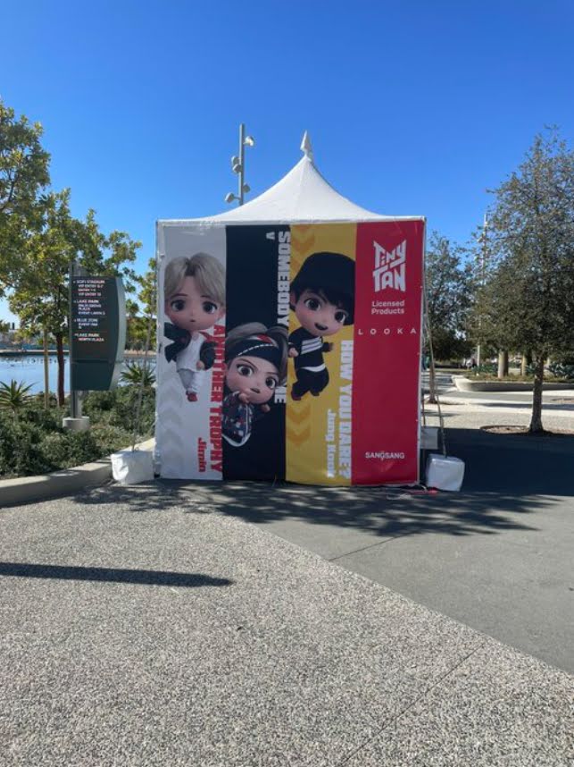 А тем временем в Твиттер уже сливают то, как выглядит сцена. Еще до того, как вы приблизитесь к стадиону, вы сразу увидите огромную статую «PERMISSION TO DANCE ON STAGE». Идеальная локация для селфи и просто памятных фотокарточек! На других изображениях фанатов были показаны стенды, созданные в сотрудничестве с различными брендами. Разумеется, дело не обошлось без палаток с различным мерчем парней.