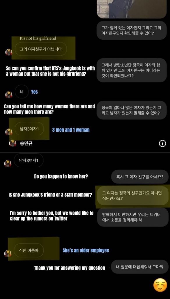 Удалось выяснить, что Чонгук проводил вечер не только в компании брюнетки. Мужчина заявил, что компания состояла из трех парней и одной девушки. АРМИ попытались выяснить, знаком ли владелец мясного ресторана со спутницей айдола. «Она в возрасте, это [их] сотрудница», — лаконично ответил Сон Мингю (Song Mingyu). Вероятно, речь шла о команде BTS, которая сопровождает артистов и во всем им помогает. Парни-спутники тоже были из «стаффа» (stuff / команды).