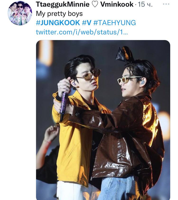 Сегодня поклонники обсуждают снимок, который оказался во вкладке «Популярное» в Твиттере. На нем можно увидеть, как Чонгук тянется в объятия к Ви (V) прямо на сцене. АРМИ были в восторге от такого взаимодействия кумиров, зал заполнился громкими визгами и криками. Особое внимание привлекли губы Золотого макнэ — у многих сложилось впечатление, что он явно хотел наградить близкого человека дружеским поцелуем.