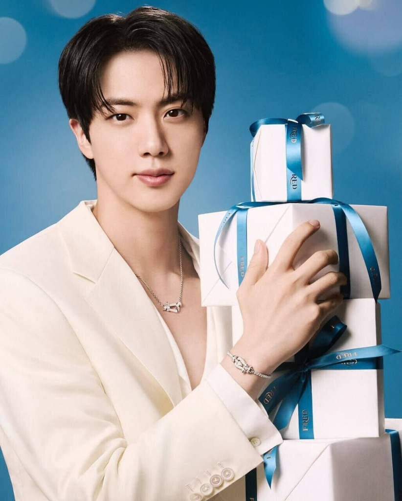 Завершил этот парад рекламных кампаний Джин. Парень продемонстрировал новую коллекцию украшений ювелирного дома FRED Jewelry. На фото айдол в белоснежном костюме держит стопку красиво упакованных подарков. Но вот пользователи сети решили, что «красивая упаковка» на снимке есть только на Джине. И никто вовсе не против получить такой подарочек к новому году.
