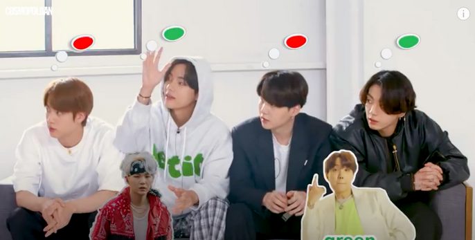Джей-Хоуп (J-Hope), Ви (V), Чонгук (Jungkook) и RM выбрали зеленый, а Шуга (Suga), Джин (Jin) и Чимин (Jimin) выбрали красный.