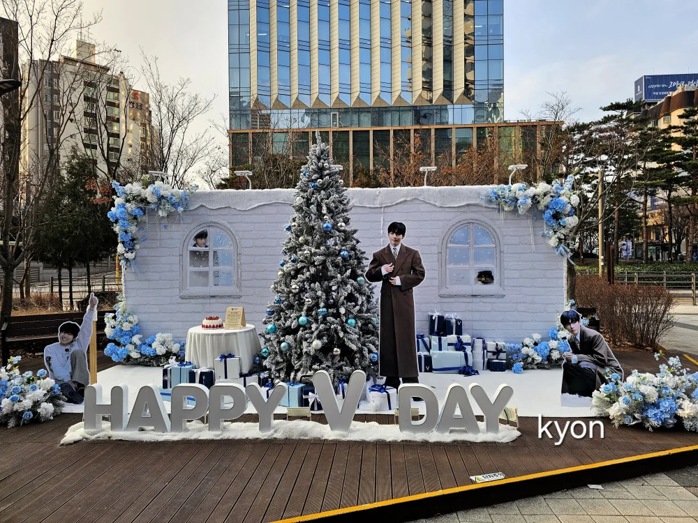 Напротив популярного торгового центра Seongsu XYZ поклонники установили подарок, из которого вылезает Ви. Рядом расположили поздравительную надпись и небольшую ёлку с надписью «Счастливый день Ви!». Любой желающий мог сфотографироваться около инсталляции и запостить снимок в социальную сеть.