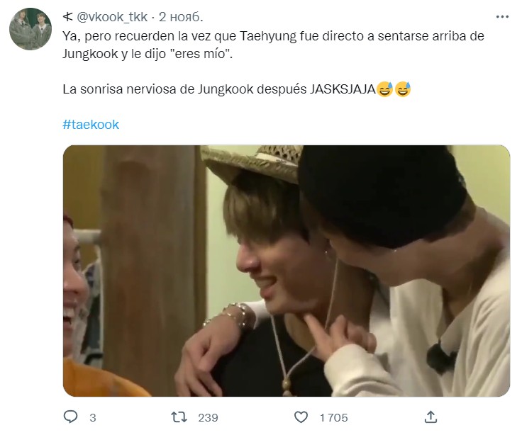 Как-то раз участники группы собрались вместе, чтобы отдохнуть от бытовых дел. Вся компания расположилась перед камерой, а Вишня смело залез на колени своему другу, схватив его одним пальчиком за подбородок, повернув к себе и заявив: «Ты мой». Да уж, иногда скромняга Тае поражает своим напором. Наверное, Гуку с ним точно не скучно, ведь мы не знаем, насколько дерзким он может быть, когда остается с BFF наедине.
