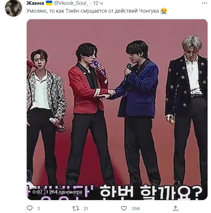 Любительница психологических книг из рядов АРМИ опубликовала пост на английском языке, где на основе своего жизненного опыта и прочитанного материала поделилась мнением о паре Чонгука (Jungkook) и Ви (V). Девушка привела в пример несколько моментов, которые, по ее мнению, доказывают наличие сексуального влечения в этой паре. Во-первых, каждый раз, когда кто-то в коллективе произносит шутку, они всегда сразу же смотрят друг на друга. «Знаете ли вы, что в компании мы всегда в первую секунду смотрит на того, кто нам роднее всего? Так человек пытается найти поддержку в самом любимом человеке», — написала она в посте.