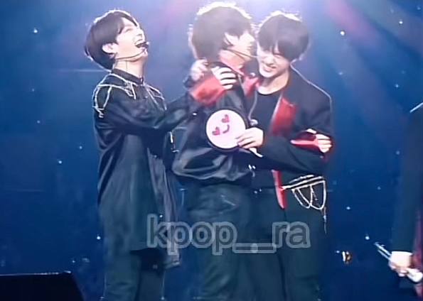 Куки не хотел затягить постановочный скандальчик и сразу же вытянул руки, чтобы обнять своего друга Ви, но тот не бы намерен так быстро прощать селеба. А для того, чтобы уколоть его еще больше, Тэ тут же повернулся к BFF спиной и нашел утешение в объятиях Джина (Jin). Он, конечно, позаботился о своем приятеле, но не мог сдержать свой смех. С этой ревнивой парочкой друзей ни Джину, ни другим мемберам «Бантан» точно не бывает скучно!