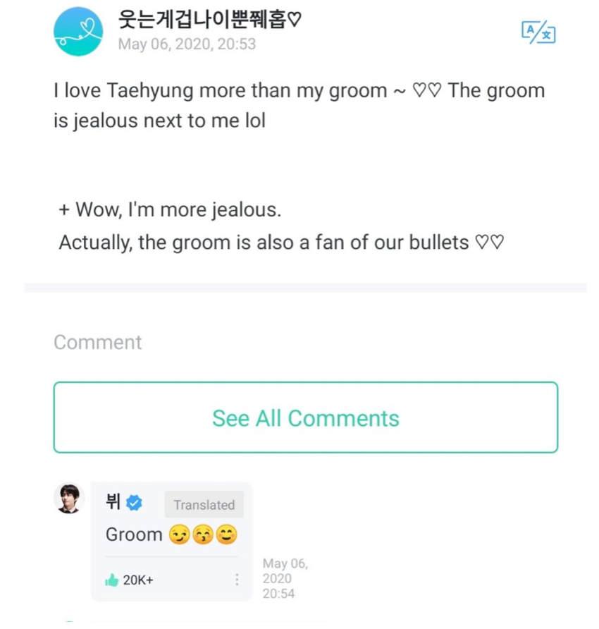 Тэхён (Taehyung) оказался в центре семейных разборок. Накануне на WeVerse по своей доброй вечерней традиции Айдол сел отвечать и читать сообщения от поклонниц, одна из фанаток, написала бурное сообщение, что V (Ви), буквально разрушает её грядущий брак: