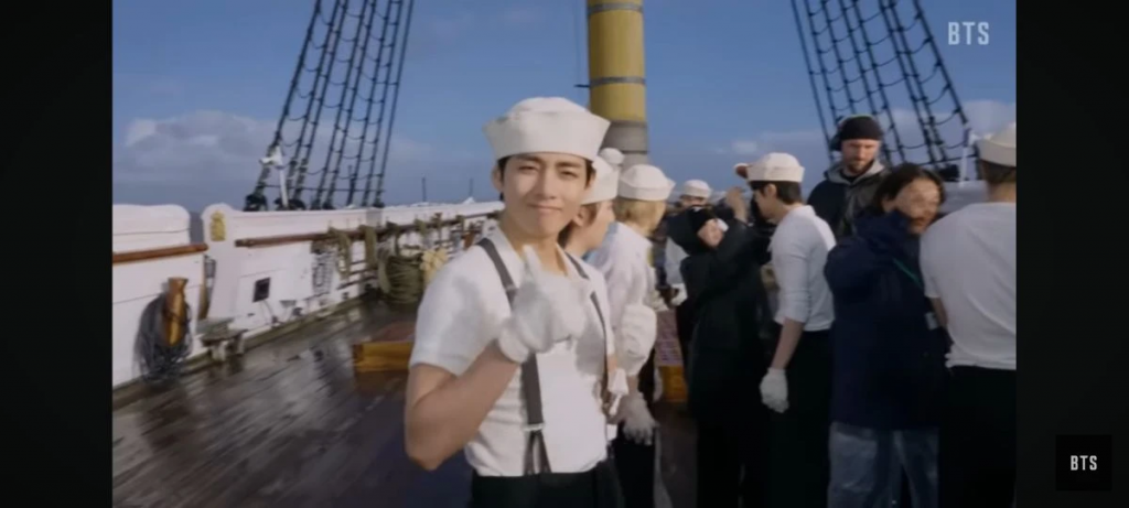 Чонгук усиленно крутит настоящий штурвал, RM чертит и разбирает настольные карты, Джин загадочно смотрит в иллюминатор, проговаривая слова песни. Отдельного внимания заслуживает момент, когда Джей-Хоуп пляшет под настоящим проливным дождем.