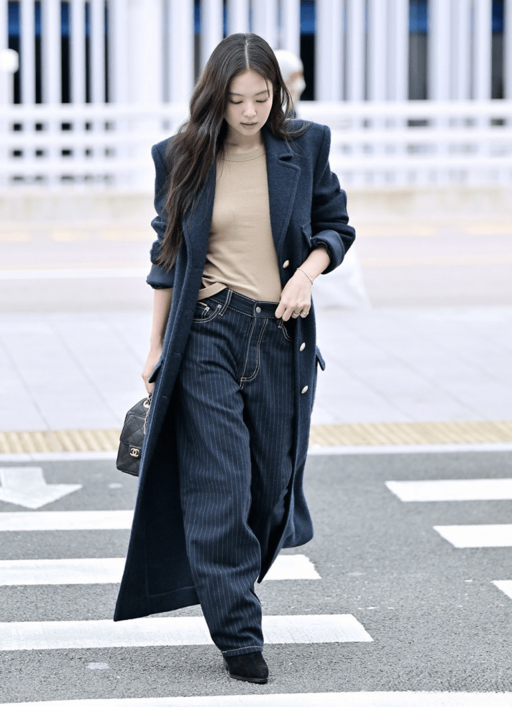 Для полёта в столицу моды вокалистка Blackpink выбрала тёмные джинсы кроя клёш, светлую футболку и тёмно-синее удлинённое пальто с серебряными пуговицами. Образ Дженни лишний раз напомнил, что в Южной Корее осень вступила в свои законные права.