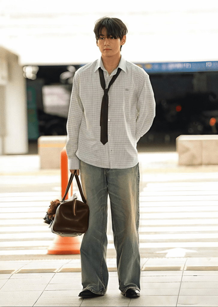 Ви отличился броскостью. Парень выбрал простые джинсы, светлую рубашку в клетку и чёрный галстук. Рубашку вокалист специально не заправил, а галстук отпустил, как будто собирается его вовсе снять.