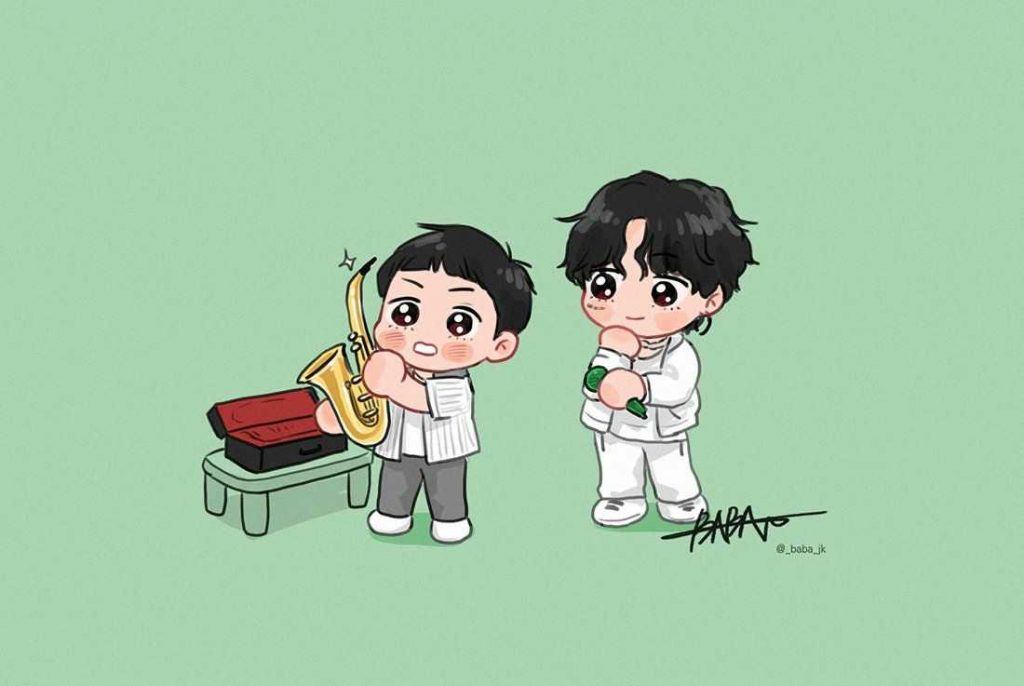 Так недавно повезло одной талантливой девушке, которая изобразила айдлов в начале их творческого пути. Например, есть рисунок, где Джин (Jin) смотрит на себя маленького, когда тот пытается разобраться в карте.