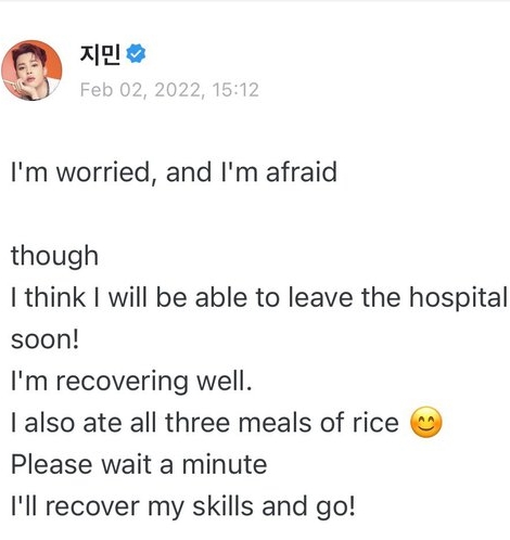 Как оказалось, автоматический перевод был неверным и Чим начал сообщение с извинений, а не с попытки напугать фанатов: «Я прошу прощения зато, что вы беспокоитесь за меня». В дальнейшем Чимми сообщил более приятные новости: скоро он сможет покинуть клинику, ведь достаточно быстро поправляется. «Я регулярно питаюсь… ем 3 приема пищи с рисом. Подождите меня немного, я поправлюсь и вернусь к вам!» — пообещал парень верным подписчикам.
