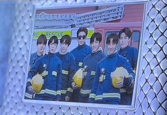 Следующий кадр, представленный ниже — это так называемая бригада пожарных, работающих в одну смену. Мы, конечно, все понимаем, и все эти знакомые лица действительно являются коллегами Макнэ, но с каких пор он ушел из музыкальной индустрии и посвятил свою жизнь тушению объектов? Да уж, эта 7-ка BTS полна секретов…