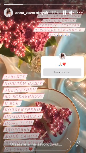 Она обратилась к родительнице в stories на личной страничке Instagram и поздравила любимую маму с юбилеем: «С днем рождения моя самая любимая Мамочка, ты мой самый яркий свет». В следующих публикациях девушка поблагодарила своих подписчиков за многочисленные сообщения с теплыми словами и попросила пользователей помолиться за здоровье Анастасии Заворотнюк: «Давайте пошлем нашу энергетику во Вселенную и все коллективно помолимся и пожелаем здоровья моей самой лучшей маме на свете».
