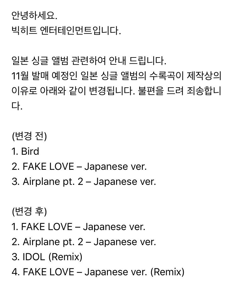 «Из-за производственных причин треклист нового ноябрьского японского альбома был изменен. Мы приносим извинения за доставленные неудобства», — написали в Big Hit.