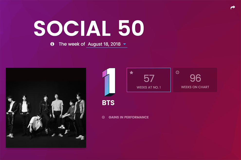 Угадайте, кто красуется на 1 строке рейтинга Sociаl 50 от Billboard? Правильно — BTS. А кто красуется там дольше всех остальных музыкальных исполнителей? Снова BTS!