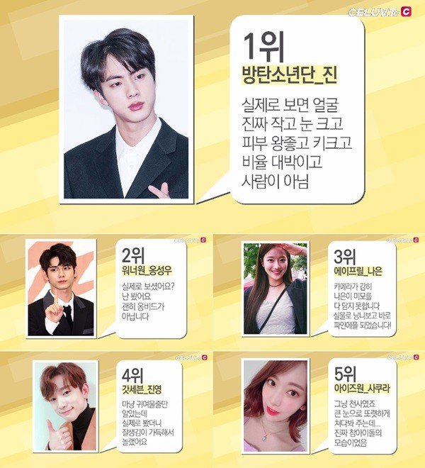 Джин обогнал Он Сон У (Ong Seong Woo) из группы Wanna One и красоток Наын (Naeun) из герлз-бэнда April и Мияки Сакуру (Miyawaki Sakura) IZ*ONE.