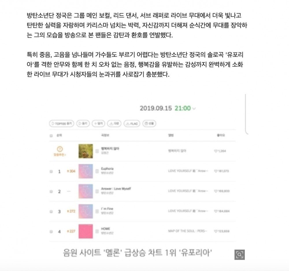 [Article] K-media reports on @BTS_twt's Jungkook, saying that after 'Love Yourself in Seoul' re-aired on JTBC, his song 'Euphoria' rose 304 places to #1 on Melon's rising chart, proving the power of a 'vocal king' who is recognized by Billboard.#PCAs #TheMusicVideo #BoyWithLuv pic.twitter.com/kUKOLW0gqJ