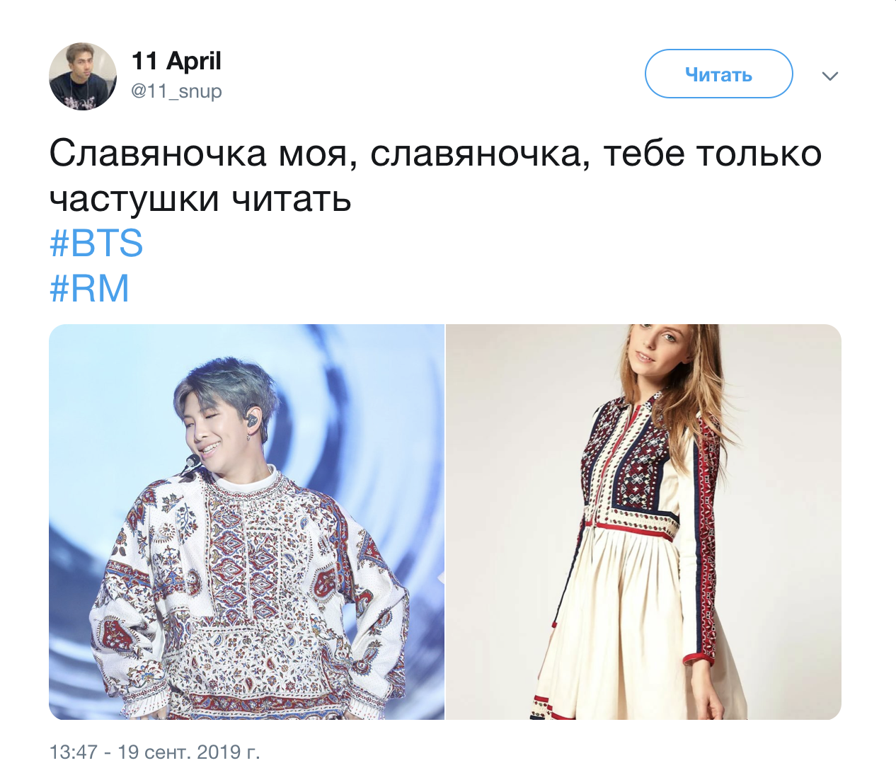 А вы можете представить себе RM из BTS в образе простого русского парня? В расписной яркой рубахе и улыбающимся во все тридцать два зуба? Поклонники нашли одну из фотографий с концерта группы, где айдол похож на Иванушку из сказки, и сделали коллаж со снимком, где изображена девушка в расшитом нитками белом платье.