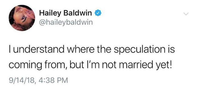 Оказывается, свадьба Джастина Бибера (Justin Bieber) и Хейли Болдуин (Hailey Baldwin) оказалась фейком! Несколько часов назад девушка опровергла слухи о том, что она уже вышла замуж за музыканта.