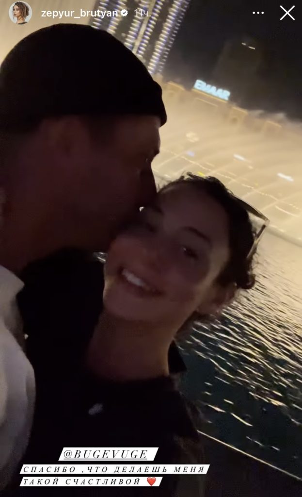 Пара российских звёзд направилась в Дубай. Со стороны создается впечатление, что оба действительно безумно счастливы. Девушка танцует на фоне поющих фонтанов, любимый целует и обнимает её, они вместе делятся романтическими моментами со своей аудиторией. Правда, на днях с Прилучным произошел забавный конфуз: он так сильно загорел на палящем солнце в Эмиратах, что Брутян перестала видеть его в темноте, о чем шутя сообщила в своем блоге.