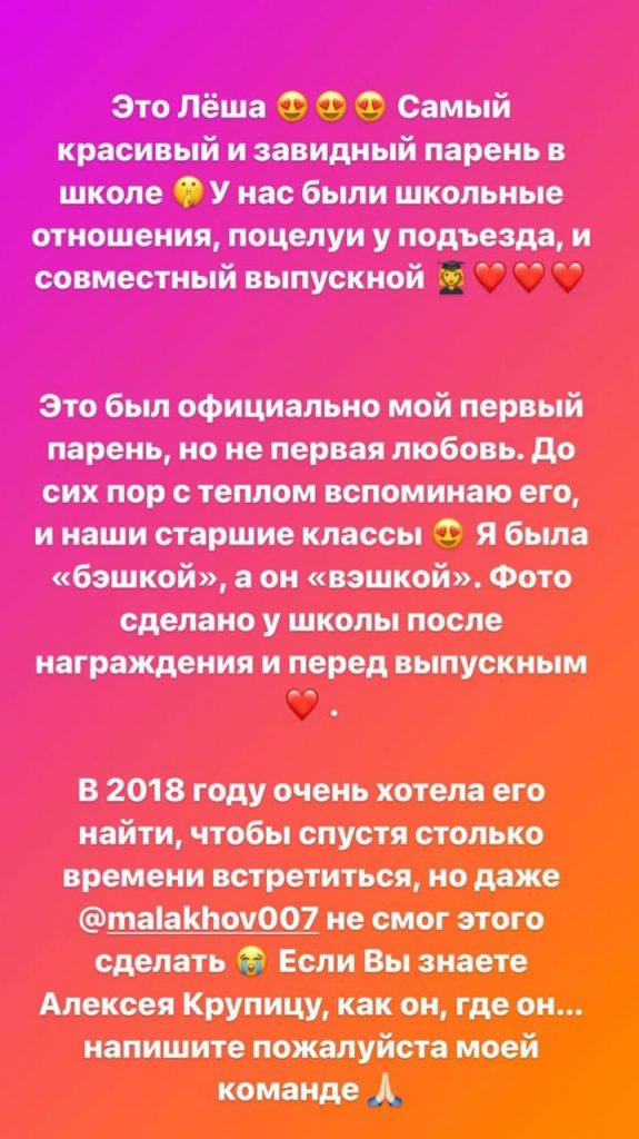 «У нас были школьные отношения, поцелуи у подъезда и совместный выпускной. Это был официально мой первый парень, но не первая любовь. До сих пор с теплом вспоминаю его и наши старшие классы. Я была «бэшкой», а он — «выэшкой». Фото сделано у школы после награждения и перед выпускным. В 2018 году очень хотела его найти, чтобы спустя столько времени встретиться, но даже Андрей Малахов не смог этого сделать. Если Вы знаете Алексея Крупицу, как он, где он… напишите, пожалуйста, моей команде».