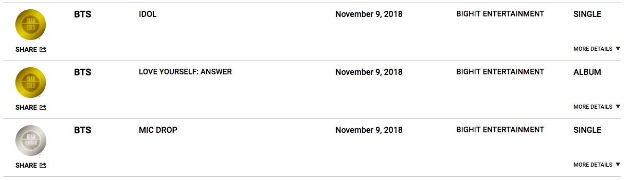 К тому же альбом BTS «Love Yourself: Answer» и заглавный трек с пластинки «IDOL» тоже были признаны золотыми. Альбом или сингл получает золотой сертификат, когда достигает 500,000 единиц.