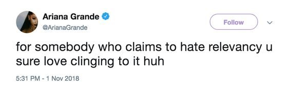Девушка отказала, на что в ответ получила «3-0». Таким образом комик высмеял неудачные отношения, в том числе и с Арианой. Певица молчать не стала. Сразу после анонса шоу выложила три твита. Как бы она ни пыталась их замаскировать, все сразу поняли, кому они адресованы.