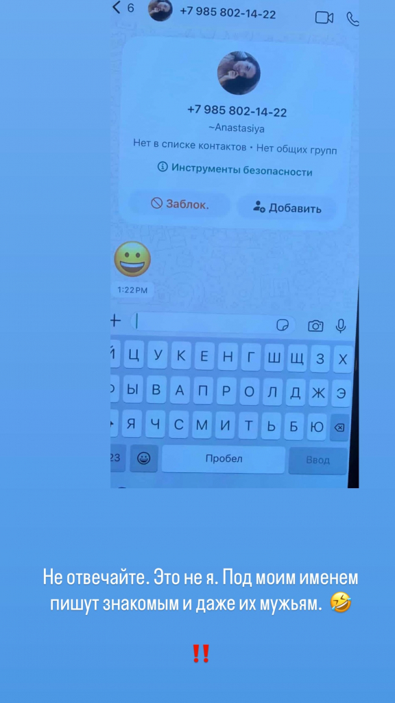 «Не отвечайте. Это не я. Под моим именем пишут знакомым и даже их мужьям», — предупредила модель, обнародовав скриншот с одним из сообщений от незнакомых недоброжелателей.