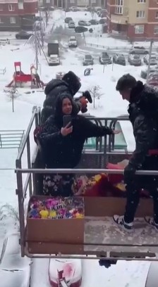Дава устроил настоящий концерт на улице Подмосковья, поднявшись с цветами на подъемнике к окнам жилых домов. Происходящее, конечно же, сразу же заинтересовало соседей, увидевших, как молодой человек, погрузив на конструкцию большое количество коробок с цветами, «поехал» вверх. «Сначала не поняли, кому это такая красота достанется, кто эта счастливая невеста у нас», — прокомментировала ситуацию бабушка, живущая напротив.