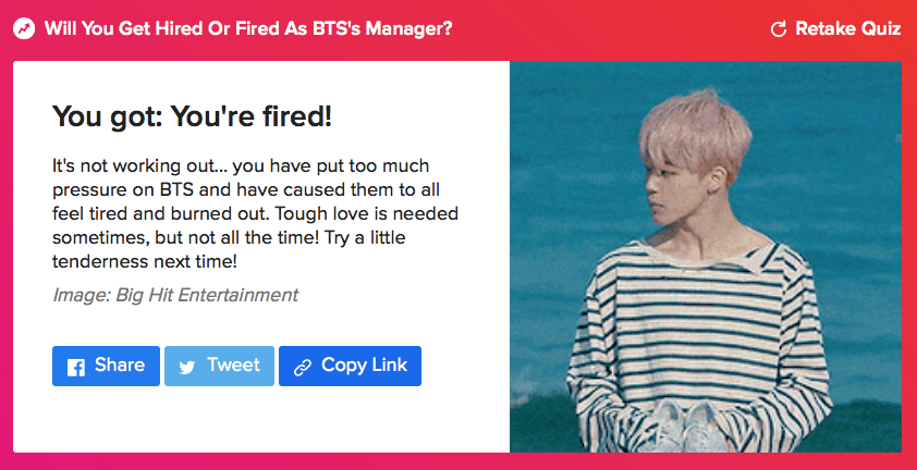 Этот тест от Buzzfeed покажет вам, смогли бы вы стать менеджером BTS, или вас бы уволили после первого же рабочего дня. Например, из-за того, что вы слишком сильно загружаете парней работой и совсем не даете им отдохнуть.