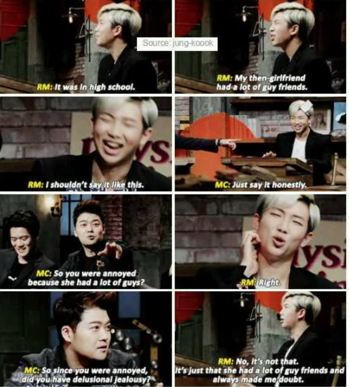В одном из интервью лидер группы RM рассказал о своих отношениях в старшей школе. Девушка, с которой встречался Ким НамДжун (Kim Nam Joon), была невероятно популярна среди мальчиков. Это вызывало в RM ревность и порождало неуверенность в себе. В конце концов, не выдержав мыслей о конкуренции, будущий музыкант принял решение прекратить отношения.