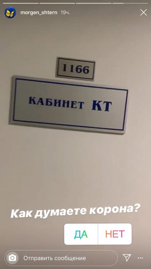 Буквально несколько часов назад самый скандальный рэпер российского шоу-бизнеса Моргенштерн выложил у себя на странице в Инстаграм сторис из больницы. На дверной табличке поликлиники написано: «Кабинет КТ», по всей видимости у артиста болезнь связанная с легкими. Сам исполнитель выставил опрос на публикации «как думаете корона?» и попросил фанатов ответить на него.