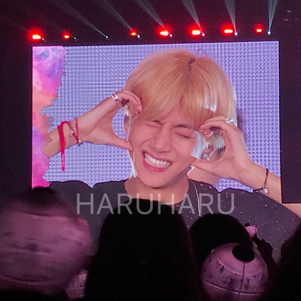 Участник корейской группы BTS Ви (V) придумал на концерте новый жест, выражающий любовь к поклонникам. Он изобразил сердечко, только не как мы привыкли, а приложил две руки к щекам.