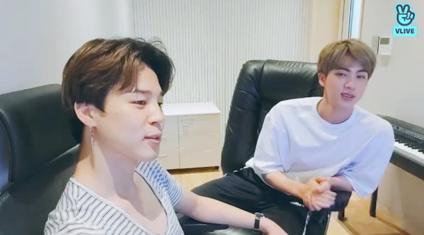 Вчера участник корейской группы BTS Чимин (Jimin) вышел в прямой эфир Vlive. Предложил поклонникам послушать сольный трек Джина (Jin) «Tonight». Как и во время двух предыдущих трансляций, он взял на себя роль диджея. Выбор этой песни, посчитал Чимин, станет отличным способом настроиться на хорошую атмосферу и зарядиться приятной энергией. Но сам Джин испортил все его планы — открыл дверь и ворвался в комнату. Да-да, прямово время прямого эфира.