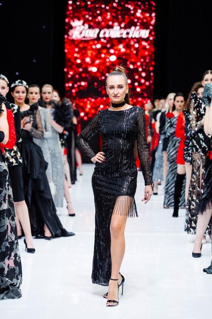 Следующим на подиуме появился бренд Rina Collection с коллекцией «I SEE RED», где широко использованы камни, бисер, блестки и пайетки, ткани и вышивки – только ручной работы, а все вещи представлены в единственном экземпляре. Несмотря что коллекция монохромная, в ней присутствует акцент – красный цвет! Название «I SEE RED» выбрано не случайно, ведь в жизни многие девушки и женщины избегают использовать его, а между тем это один из наиболее притягательных для человека и загадочный цвет из всех существующих. Этот цвет в психологии означает лидерство, настойчивость, упорство, динамичность.